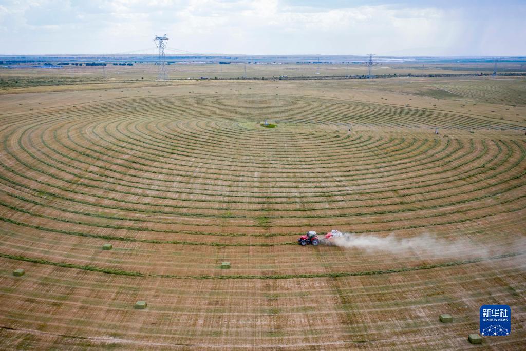在寧夏鹽池縣馮記溝鄉平臺村的優質牧草基地,農戶用機械將牧草打捆(無人機照片,2021年7月14日攝)。新華社記者 楊植森 攝