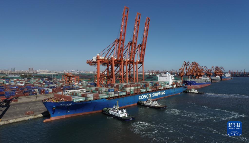 一艘輪船在拖輪的協助下向唐山港京唐港區集裝箱碼頭靠泊(2021年10月23日攝,無人機照片)。新華社記者 朱旭東 攝