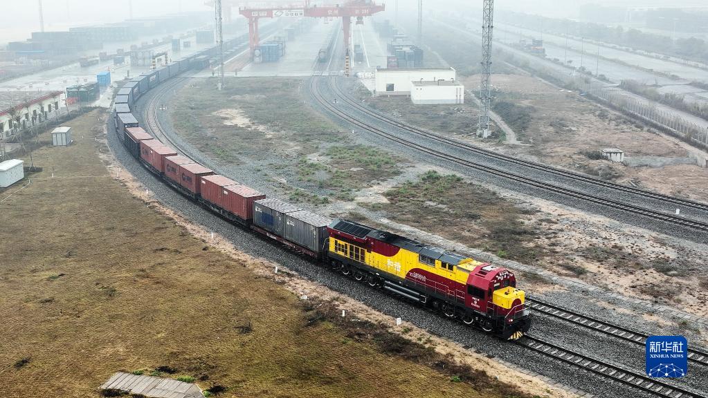 2022年1月15日,廣西新年首趟西部陸海新通道年貨班列從欽州港東站駛出(無人機照片)。新華社記者 張愛林 攝