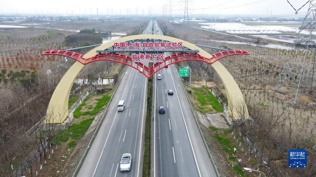 這是2022年2月10日拍攝的S2滬蘆高速上的中國(上海)自由貿易試驗區臨港新片區“海鷗門”(無人機照片)。新華社記者 方喆 攝
