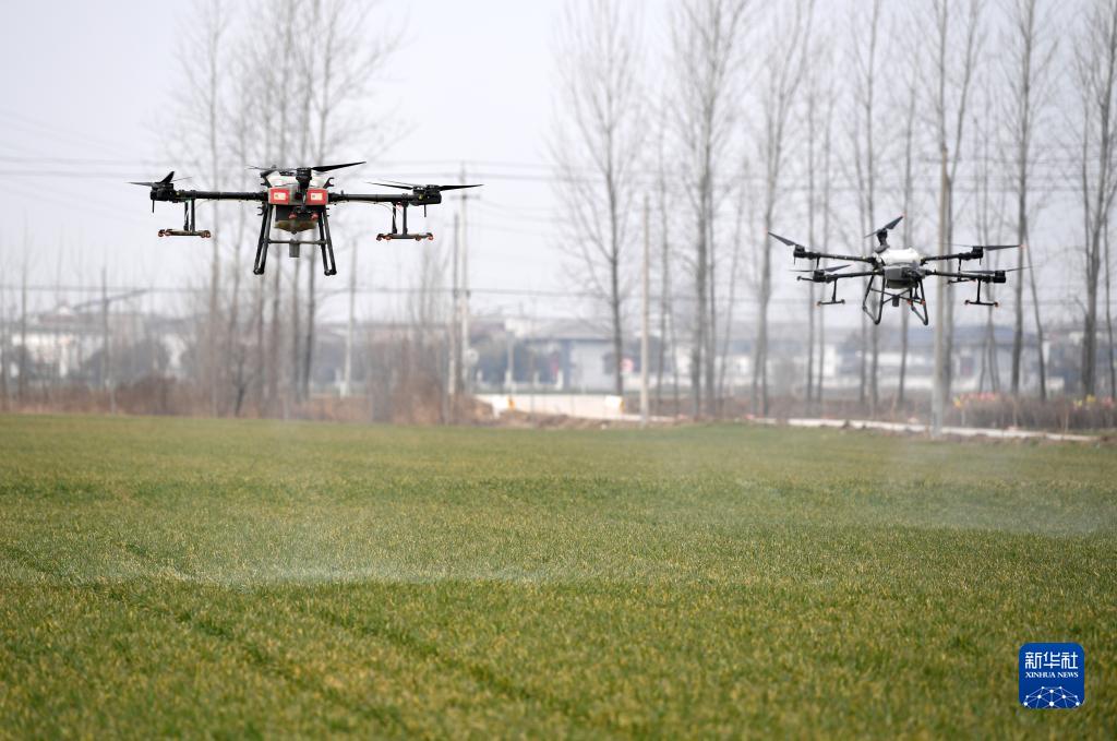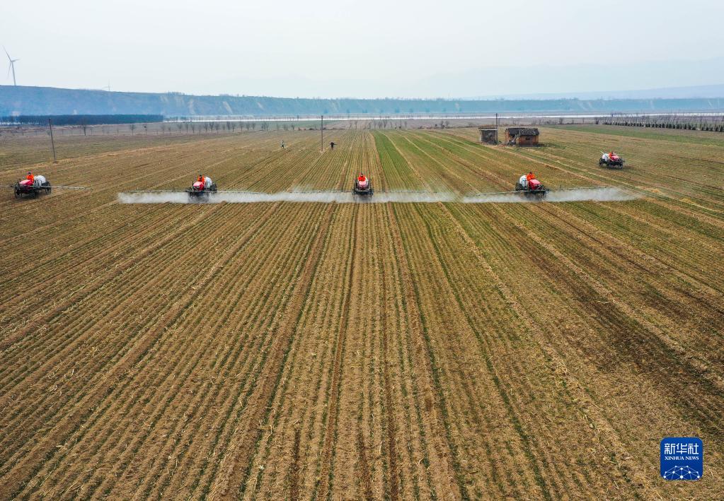 2月22日,高地隙植保機(jī)在山西省運(yùn)城市芮城縣新村作業(yè)(無(wú)人機(jī)照片)。新華社記者 柴婷 攝