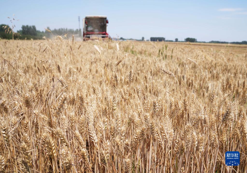 聯(lián)合收割機(jī)在河北省唐山市灤南縣長(zhǎng)凝鎮(zhèn)方泡村田間收割小麥(2021年6月22日攝)。新華社記者 楊世堯 攝