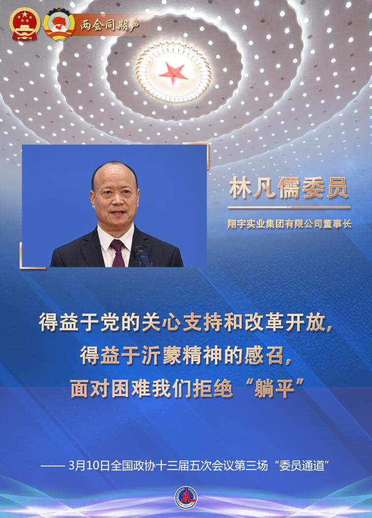來自沂蒙山革命老區的翔宇實業集團有限公司董事長林凡儒委員,講述了“水乳交融、生死與共”的沂蒙精神激勵企業發展的故事。