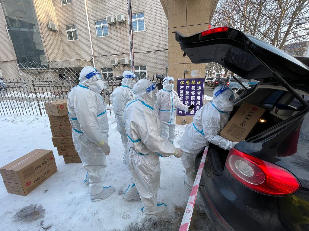 遼寧省葫蘆島市綏中縣農電小區的防疫人員在搬運為小區居民準備的湯圓。(新華社記者李昂攝)