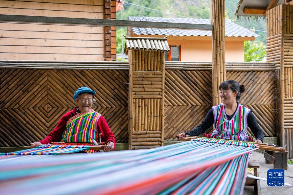 在云南省貢山獨龍族怒族自治縣獨龍江鄉迪政當村,獨龍族老人李文仕(左)和女兒在編織獨龍毯(5月10日攝)。新華社記者 曹夢瑤 攝