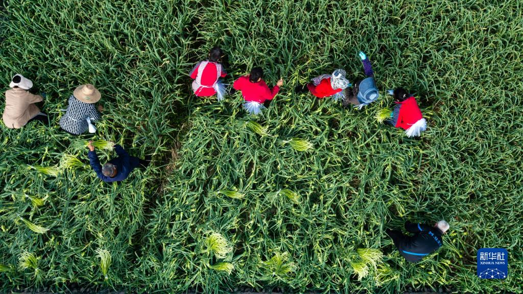 在成都市溫江區永寧街道八角社區,農民在蒜稻輪作田里采收蒜薹(3月23日攝,無人機照片)。新華社記者 沈伯韓 攝