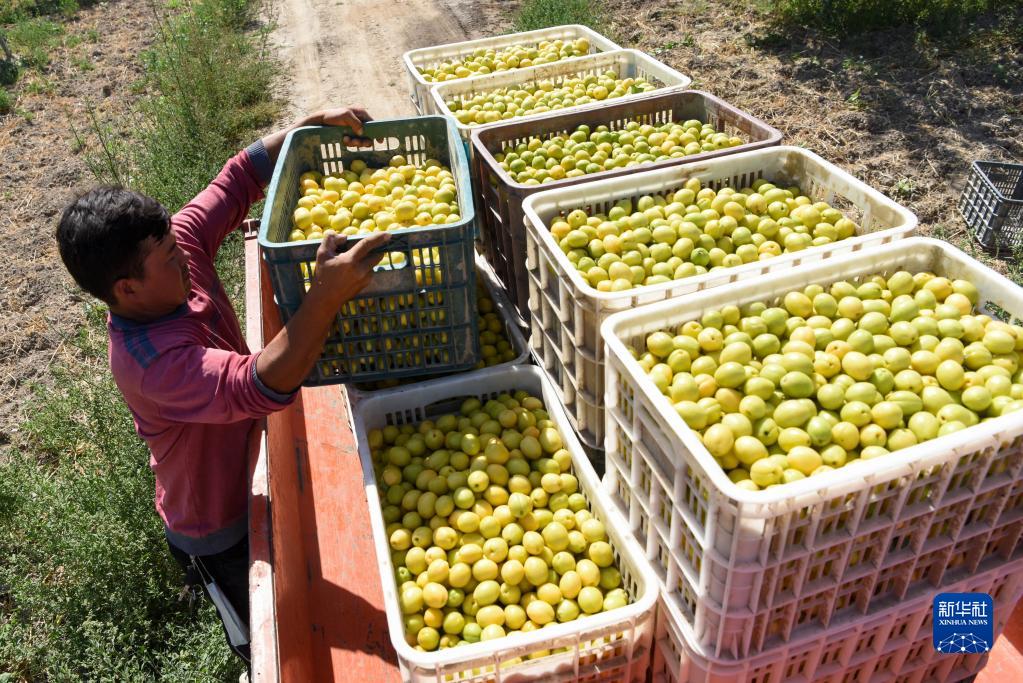 在新疆阿克蘇地區庫車市齊滿鎮齊滿村,農戶將采摘的小白杏裝車(2021年7月1日攝)。新華社記者 丁磊 攝