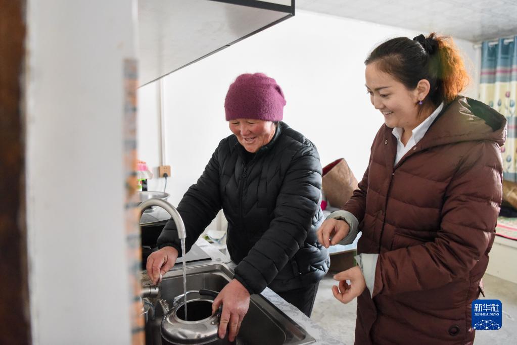在新疆福海縣解特阿熱勒鎮京什開薩爾村,村干部(右)來到前不久剛接通自來水的村民家中了解水質情況(2021年11月25日攝)。新華社記者 丁磊 攝