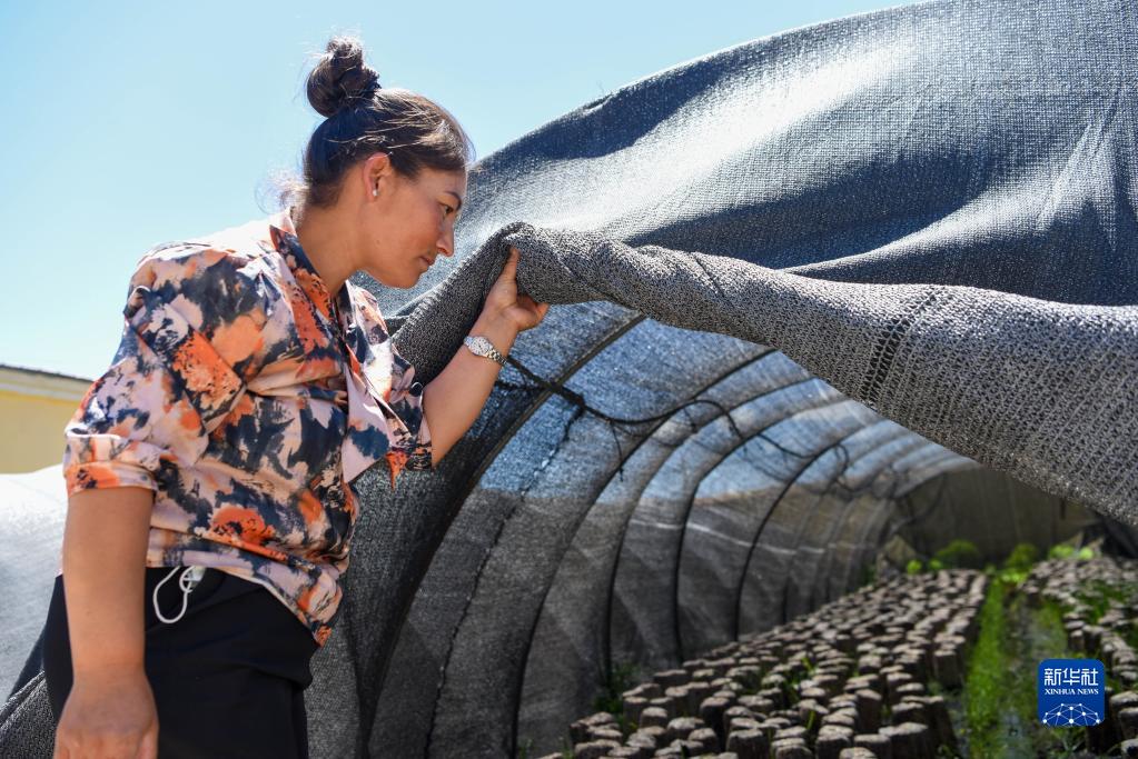 在新疆烏什縣依麻木鎮,在新疆維吾爾自治區黨委組織部、老干部局駐托萬克麥蓋提村“訪民情惠民生聚民心”工作隊的幫助下,不少村民通過培植木耳增收致富(2022年6月7日攝)。新華社記者 丁磊 攝