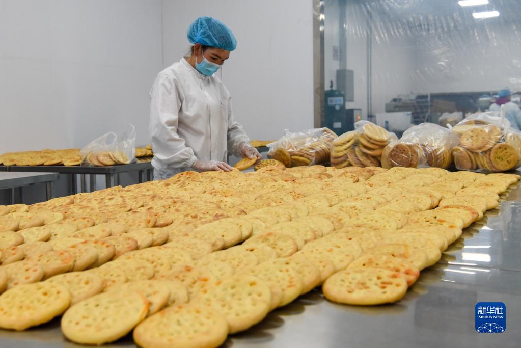 在新疆霍爾果斯馕產業園,工作人員在分揀剛做好的馕(2021年2月5日攝)。新華社記者 丁磊 攝