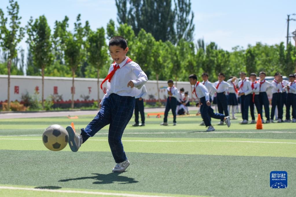 在新疆喀什地區疏附縣托克扎克鎮中心小學,學生們在上體育課(2022年6月10日攝)。新華社記者 丁磊 攝