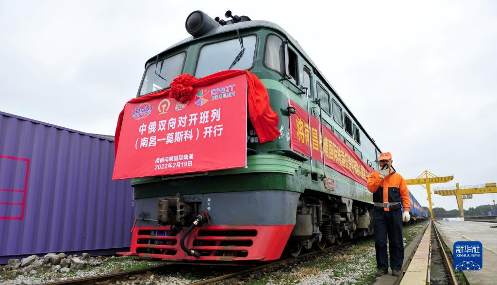 2022年江西首列中俄雙向對開班列(南昌—莫斯科)在南昌向塘國際陸港準備出發(2022年2月19日攝)。新華社記者 彭昭之 攝