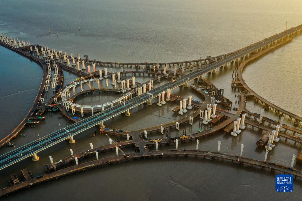 2022年7月2日拍攝的日出時分的浙江省杭甬復線濱海互通立交(無人機照片)。新華社發(胡學軍 攝)