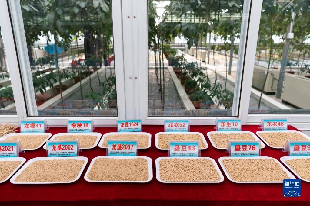這是黑龍江省富錦市北大荒建三江國家農業科技園區內展示的水稻和大豆品種(1月9日攝)。新華社記者 謝劍飛 攝