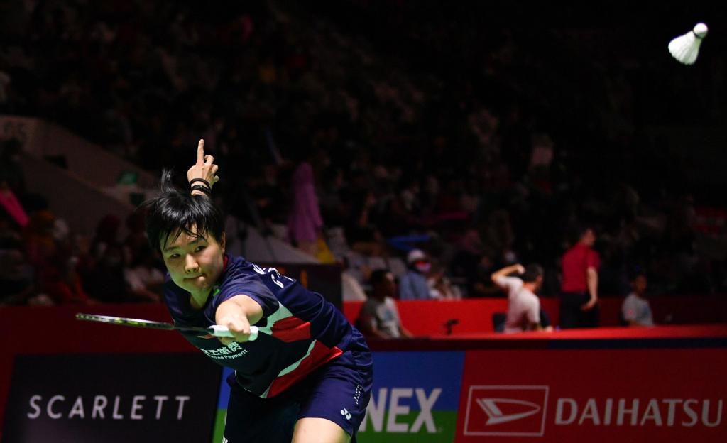 2023年1月25日,何冰嬌在雅加達舉行的2023年印尼羽毛球大師賽女單首輪比賽中回球。新華社記者 徐欽 攝