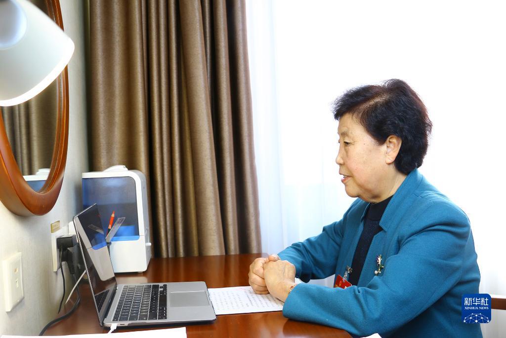 3月8日,全國人大代表、山西省昔陽縣大寨鎮大寨村黨總支書記郭鳳蓮在駐地與農業農村部工作人員視頻連線。新華社記者 胡喆 攝