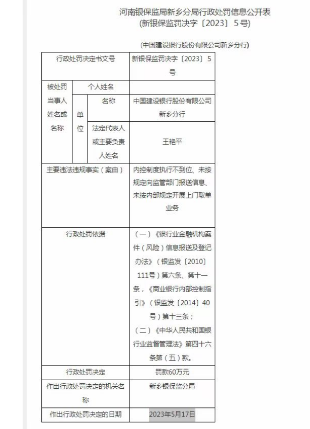 據(jù)該網(wǎng)站上河南銀保監(jiān)局新鄉(xiāng)分局行政處罰信息公開表(新銀保監(jiān)罰決字〔2023〕5號)顯示,中國建設(shè)銀行股份有限公司新鄉(xiāng)分行主要違法違規(guī)事實(案由)為:內(nèi)控制度執(zhí)行不到位、未按規(guī)定向監(jiān)管部門報送信息、未按內(nèi)部規(guī)定開展上門取單業(yè)務(wù)。