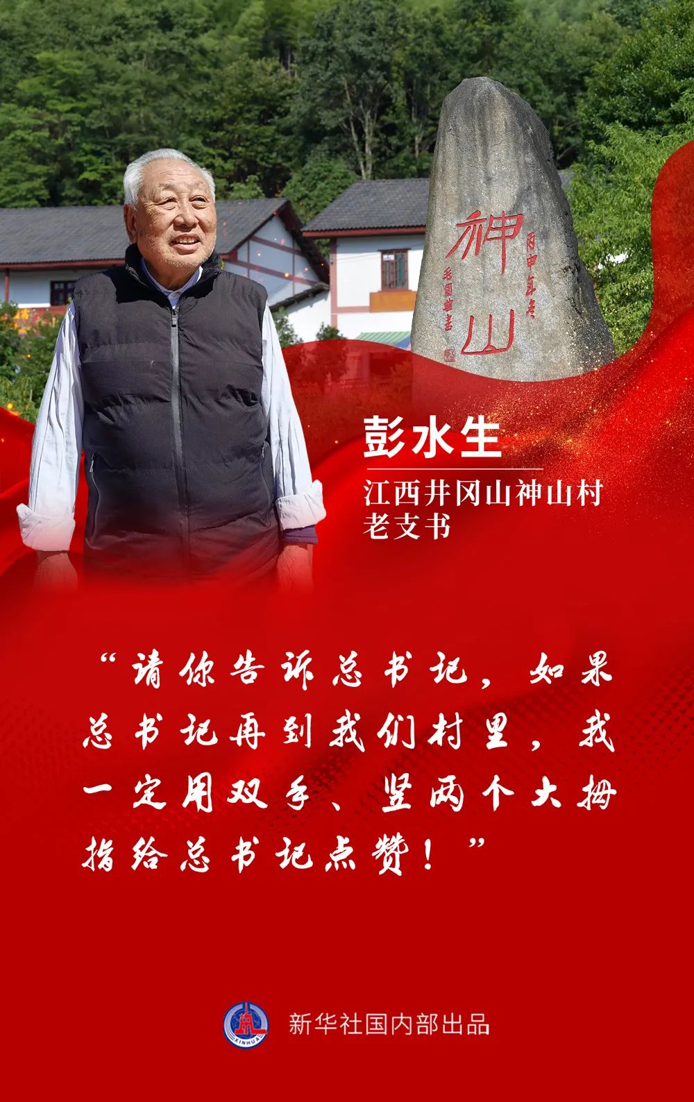 2016年,習近平總書記在神山村考察時,老支書彭水生質樸地豎起一個大拇指,贊揚總書記“你呀,干得不錯嘞”。