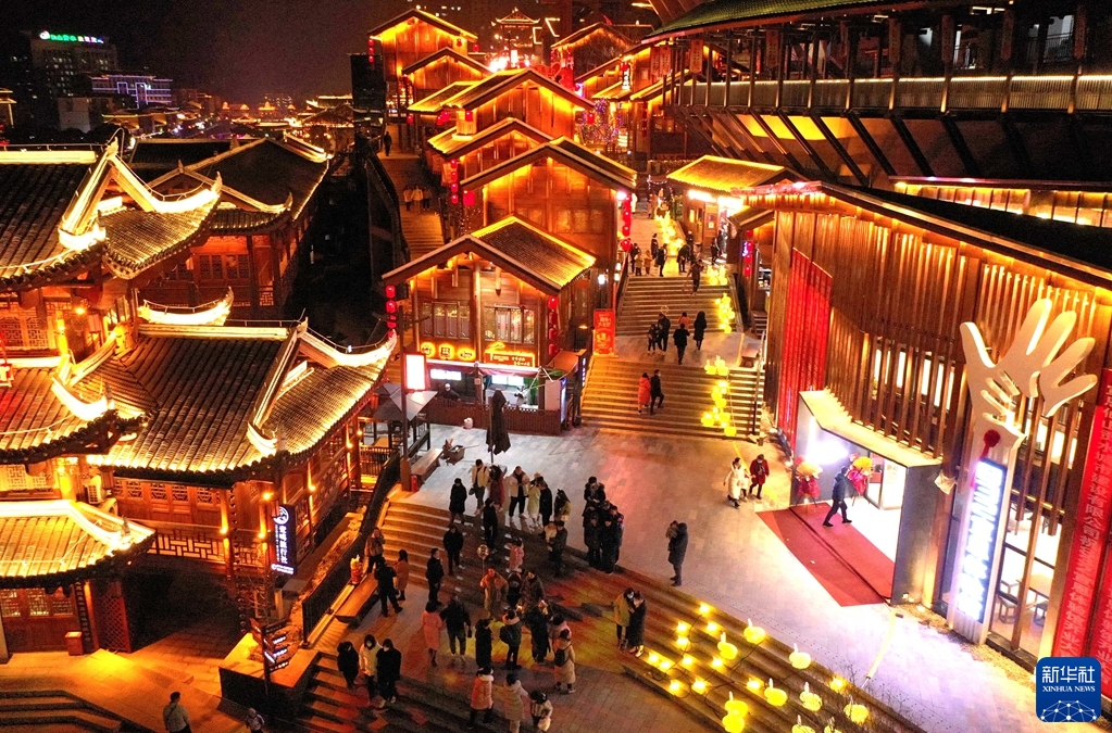 1月25日,湖北省宣恩縣興隆老街燈火輝煌(無人機照片)。新華社發(fā)(宋文 攝)
