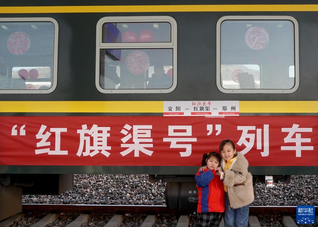 1月20日,在河南林州的鐵路紅旗渠站,兩名小朋友在“紅旗渠號”列車旁留影。新華社記者 李安 攝
