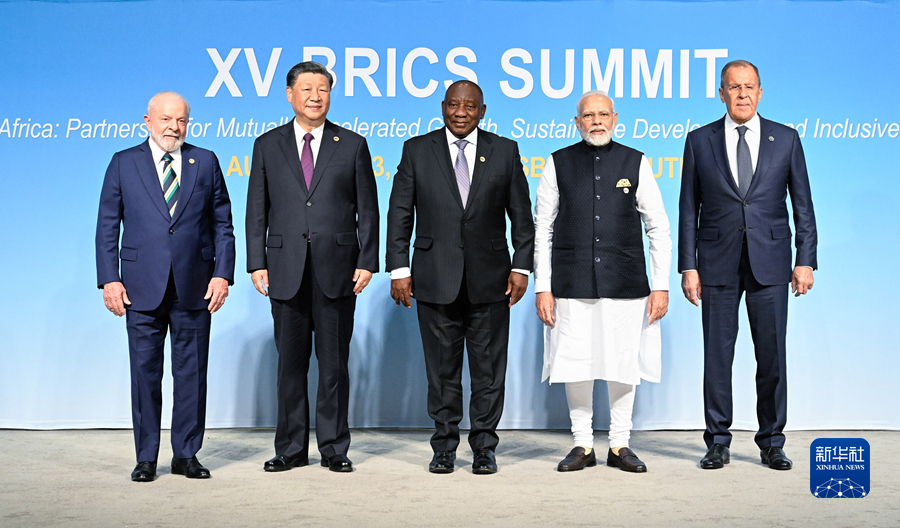 當(dāng)?shù)貢r間8月23日上午,金磚國家領(lǐng)導(dǎo)人第十五次會晤在約翰內(nèi)斯堡杉藤會議中心舉行。南非總統(tǒng)拉馬福薩主持會晤。中國國家主席習(xí)近平、巴西總統(tǒng)盧拉、印度總理莫迪和俄羅斯總統(tǒng)普京(線上)出席。這是會晤期間,五國領(lǐng)導(dǎo)人集體合影。新華社記者 李學(xué)仁 攝