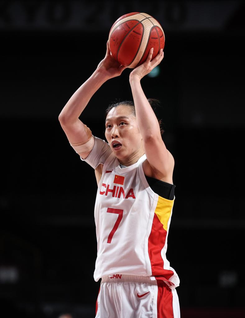 2021年8月4日,東京奧運會女籃四分之一決賽,中國隊球員邵婷在比賽中罰籃。新華社記者潘昱龍攝