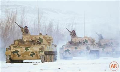1月13日,新疆軍區某裝甲團組織裝甲裝備進行冰雪地機動行軍訓練。