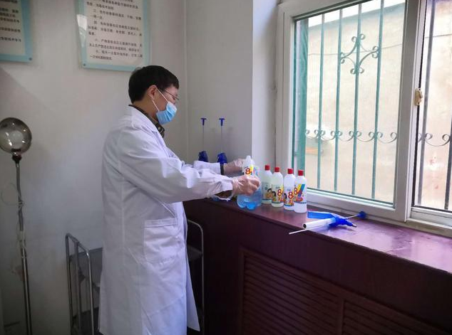 邯鄲第二干休所退休醫生白永章在調配消毒液