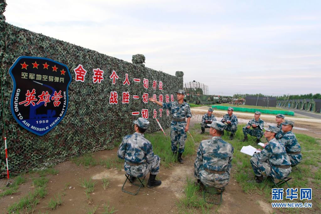 中部戰區空軍地空導彈某旅“英雄營”教導員袁天姣(站立者)為官兵講述“英雄營”精神(2020年8月20日攝)。新華社發(劉川 攝)