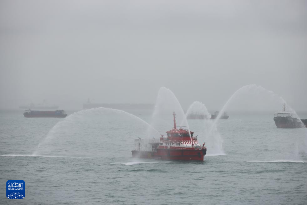 11月21日,香港特區(qū)消防船為編隊行“水門禮”。新華社發(fā)(喬晨曦 攝)