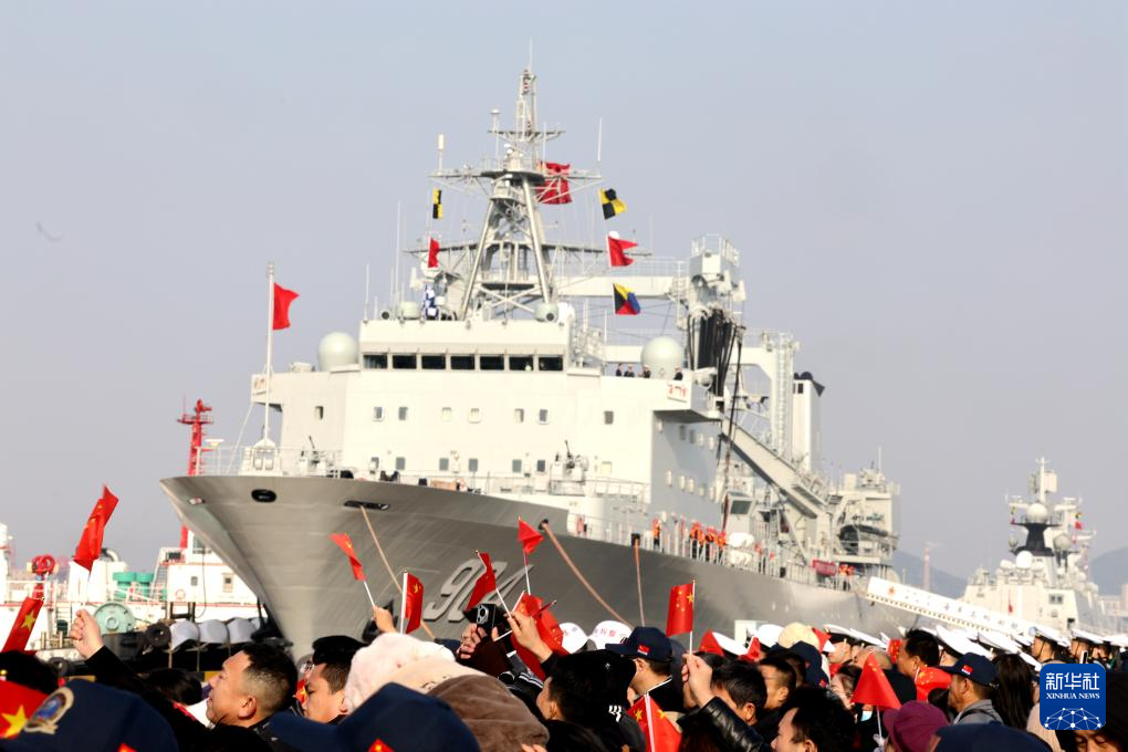 上午9時許,伴隨著嘹亮的軍樂聲,編隊艦艇依次解纜,緩緩駛離碼頭。甲板上,任務(wù)官兵整齊列隊,向祖國和親人揮手告別。