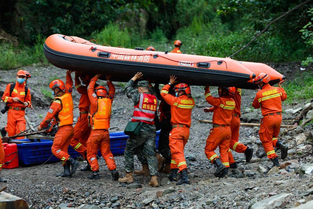 9月6日,救援隊伍正在合力將橡皮艇運往河邊,從水路繞過損毀道路。新華社記者 沈伯韓 攝