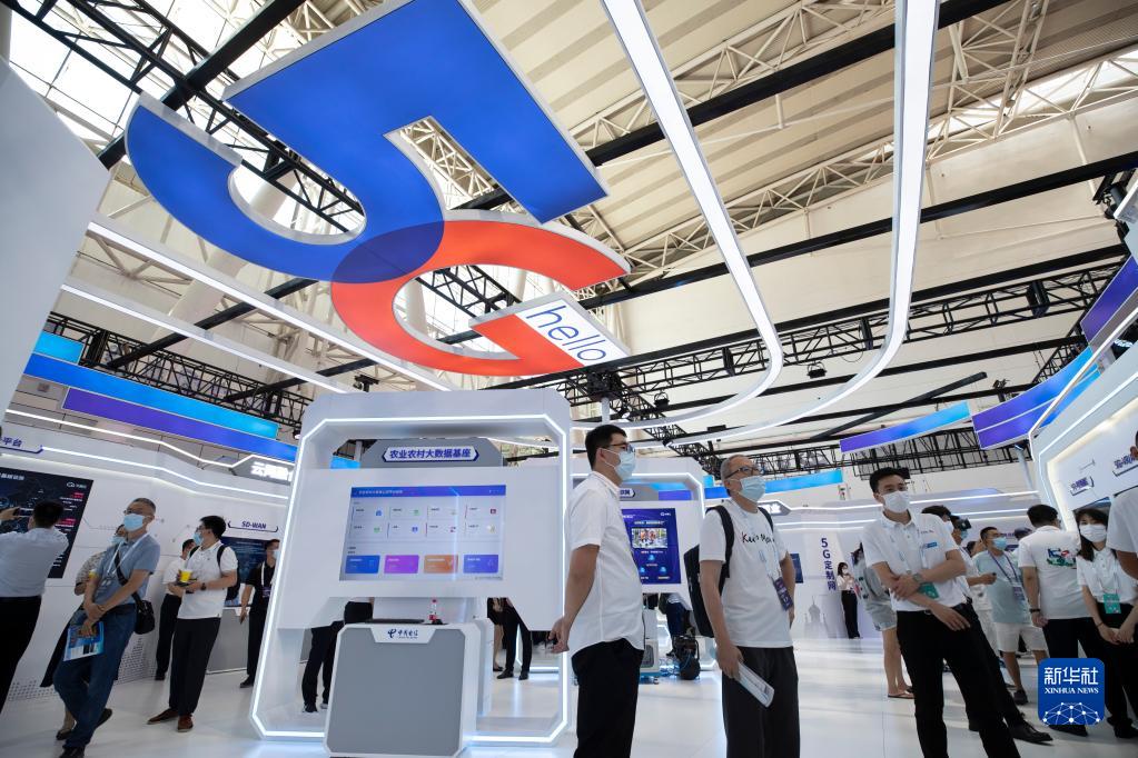 在2022世界5G大會中國電信集團有限公司展區,參觀者現場了解5G產品(2022年8月10日攝)。新華社記者 張濤 攝