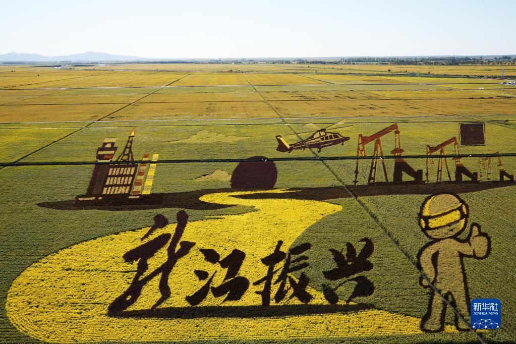 在北大荒集團建三江分公司七星農場有限公司的一塊稻田里,一幅“喜迎二十大 引領新征程”的稻田畫,吸引不少游客駐足觀看。登上觀景臺,遍野金黃,一派豐收景象。
