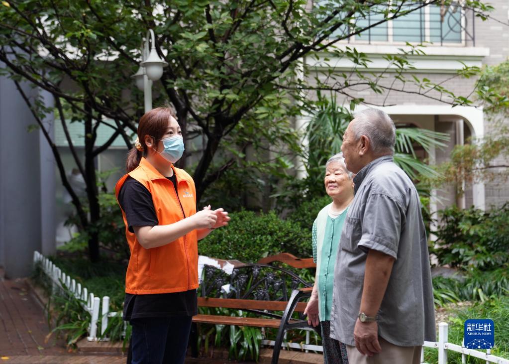 在上海靜安區(qū)石門二路街道新福康里,居民區(qū)黨總支書記魏瑛(左)在和居民交流(2022年9月15日攝)。新華社記者 劉穎 攝
