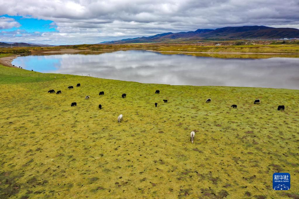 牛群和馬在黃河瑪曲段干流沿岸的一處草地上吃草(9月17日攝,無人機照片)。瑪曲縣在2019年就實現了草畜平衡。