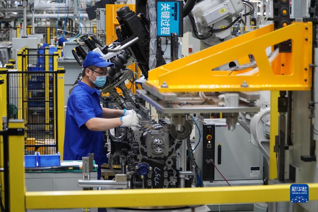 在山東省濰坊市,濰柴集團的工作人員在發(fā)動機生產(chǎn)線上工作(9月19日攝)。新華社記者 徐速繪 攝