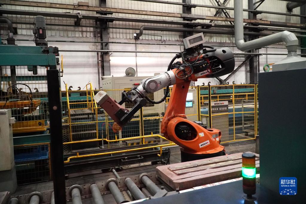 在位于山東省濰坊市的濰柴(濰坊)材料成型制造中心的生產(chǎn)車間,一臺機械手在工作(9月19日攝)。新華社記者 徐速繪 攝