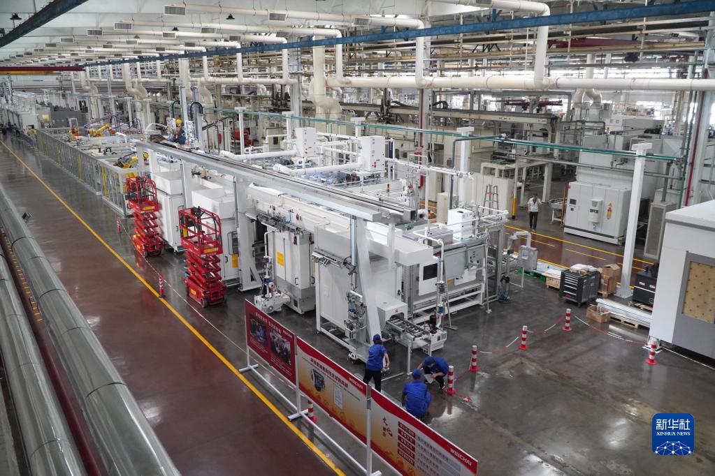 在山東省濰坊市,濰柴集團的工作人員在一條新的生產(chǎn)線上安裝調(diào)試設(shè)備(9月19日攝)。新華社記者 徐速繪 攝
