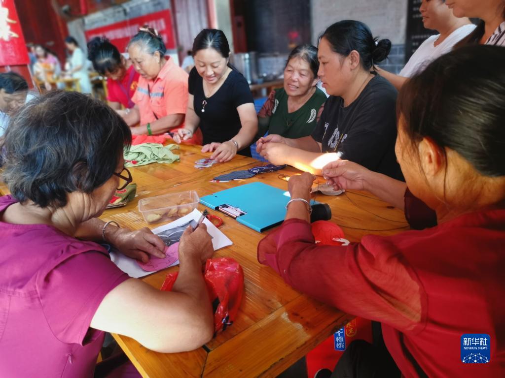 在湖南省郴州市汝城縣沙洲瑤族村的就業技能培訓現場,村黨支部書記、村委會主任朱向群(右)幫繡花的村民在紙板上描摹圖案(2022年9月19日攝)。新華社記者 周楠 攝