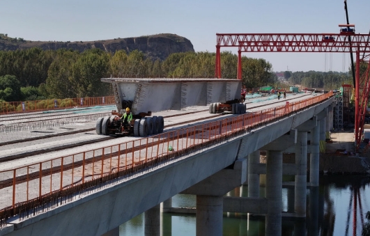 圖為:工人在河北省灤州市內(nèi)的秦唐高速公路跨灤河大橋建設工地施工。楊世堯 攝
