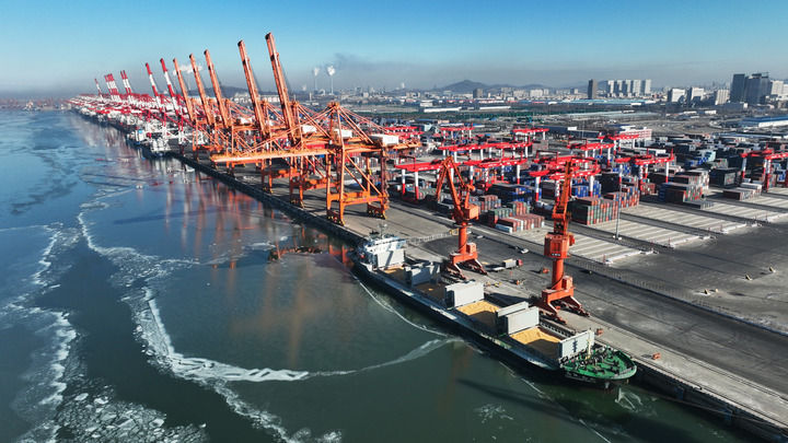 貨船在遼寧營口港碼頭裝運糧食(2024年1月10日攝,無人機照片)。新華社記者 楊青 攝