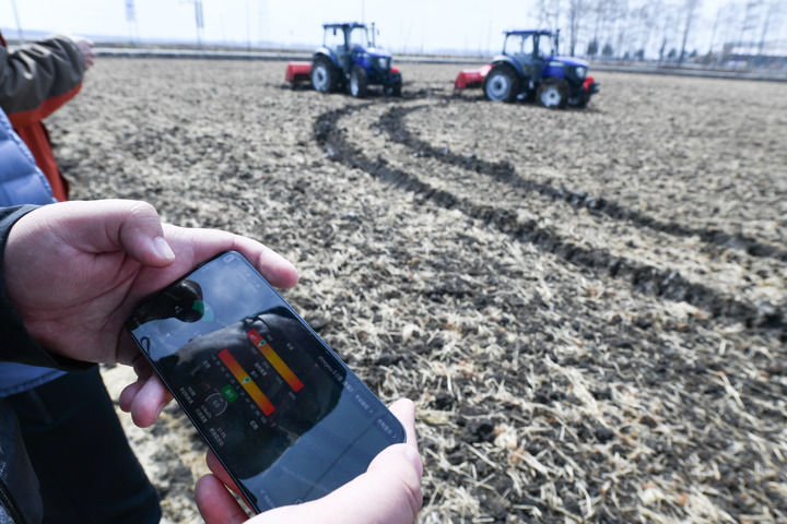 在黑龍江北大荒農業股份有限公司友誼分公司智慧農場的地塊內,技術人員操作兩輛拖拉機進行無人駕駛測試(2024年4月3日攝)。新華社記者 王松 攝