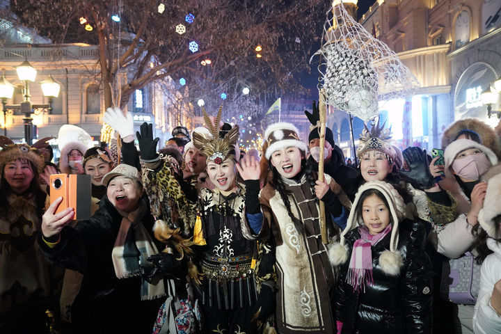 身著赫哲族服飾的赫哲族群眾和饒河縣文旅推薦官在哈爾濱中央大街與游客互動(2024年1月6日攝)。新華社記者 王建威 攝