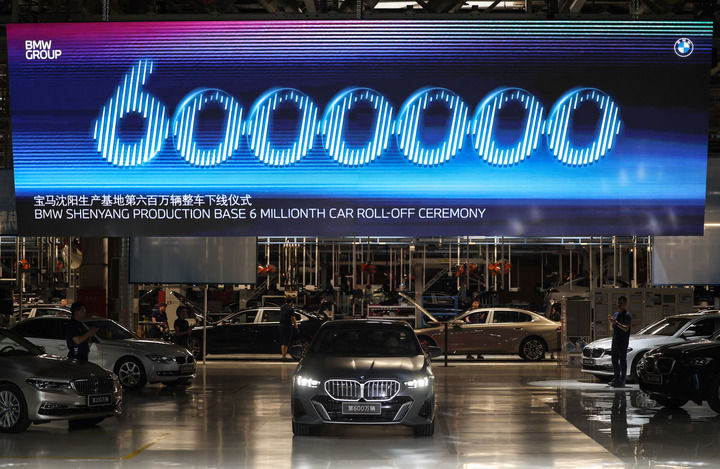 在寶馬沈陽生產基地拍攝的華晨寶馬第600萬輛整車下線儀式(2024年5月8日攝)。新華社記者 潘昱龍 攝