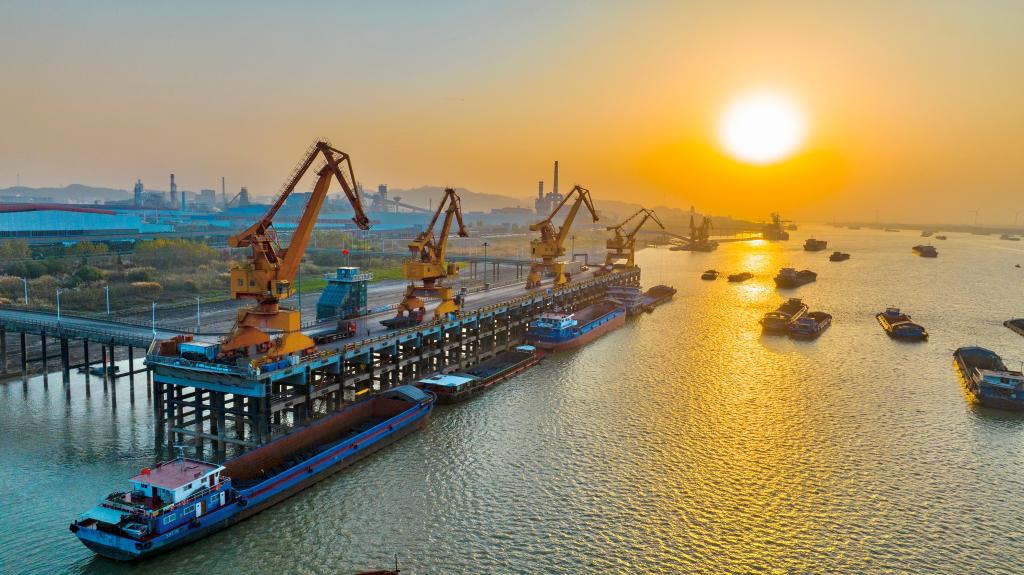 這是九江市湖口縣的方大九鋼碼頭在進行產品發運。新華社發(張玉攝)