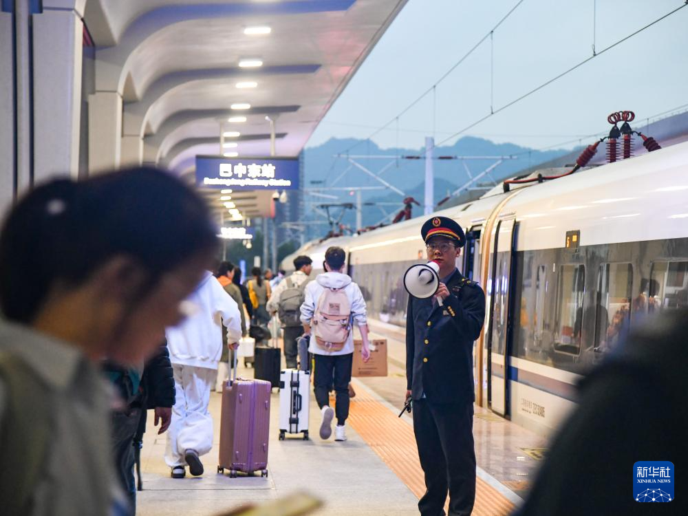 10月6日,在四川省巴中市巴中東站,工作人員引導旅客乘坐列車。