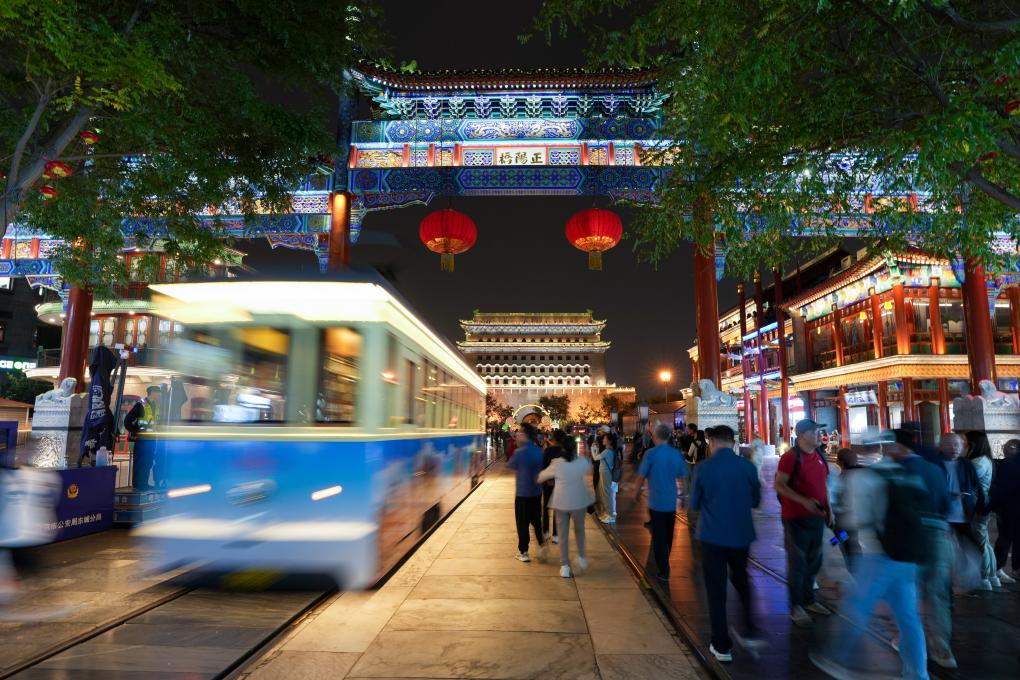 為迎接新中國成立75周年,北京點(diǎn)亮中軸線上的地標(biāo)建筑。游客在前門大街和正陽門箭樓前參觀游覽。新華社記者 鞠煥宗 攝