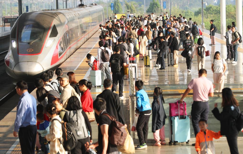 10月6日,旅客在湖南省衡陽東站站臺(tái)排隊(duì)乘車。新華社發(fā)(曹正平 攝)