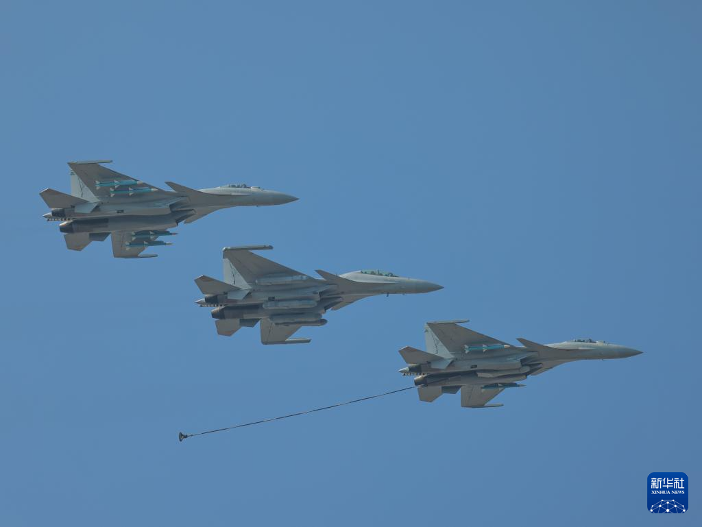 海軍殲-15系列艦載戰(zhàn)斗機(jī)編隊(duì)在廣東珠海進(jìn)行適應(yīng)性飛行訓(xùn)練,展示伙伴加油課目(11月10日攝)。新華社發(fā)(呂志浩攝)